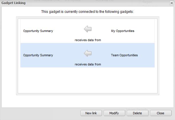 In this example, both opportunity list gadgets are senders, and the summary gadget is the receiver. This can save you space on your dashboard, as you can easily toggle the view on a single receiver gadget between the two sender gadgets.